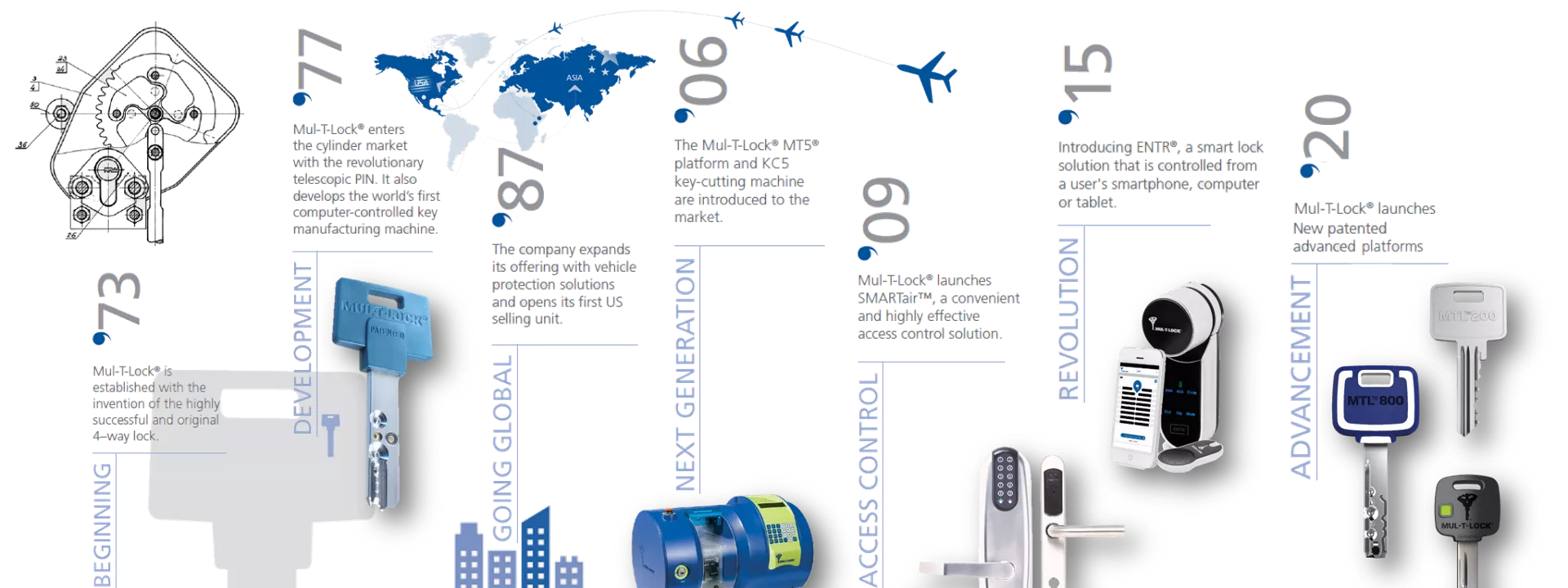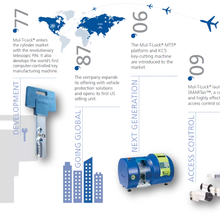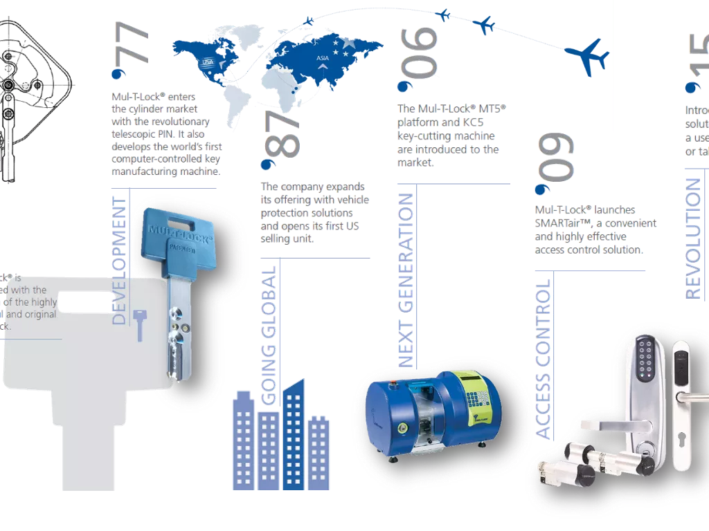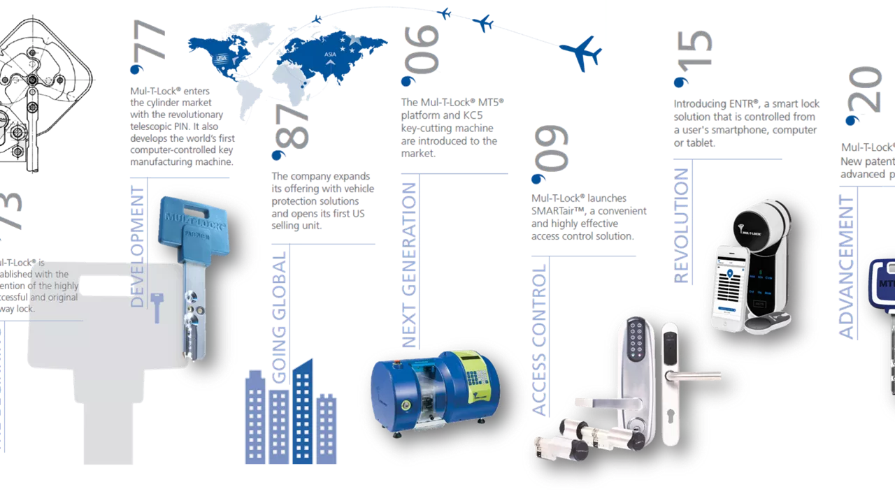 אנו מחויבים לחדשנות באמצעות מו"פ, עיצוב וייצור מצוינות במשך חמישה עשורים. פיתחנו מאות פתרונות נעילה ברמת אבטחה גבוהה שרבים מהם מוגנים בפטנט, ואימצנו טכנולוגיה דיגיטלית כדי לענות על צרכי השוק. הודות למוצרים החדשניים שלנו ולשותפויות החזקות שלנו, המותג שלנו ממשיך לצמוח ברחבי העולם באמצעות רשת ההפצה שלנו ב-80 מדינות.